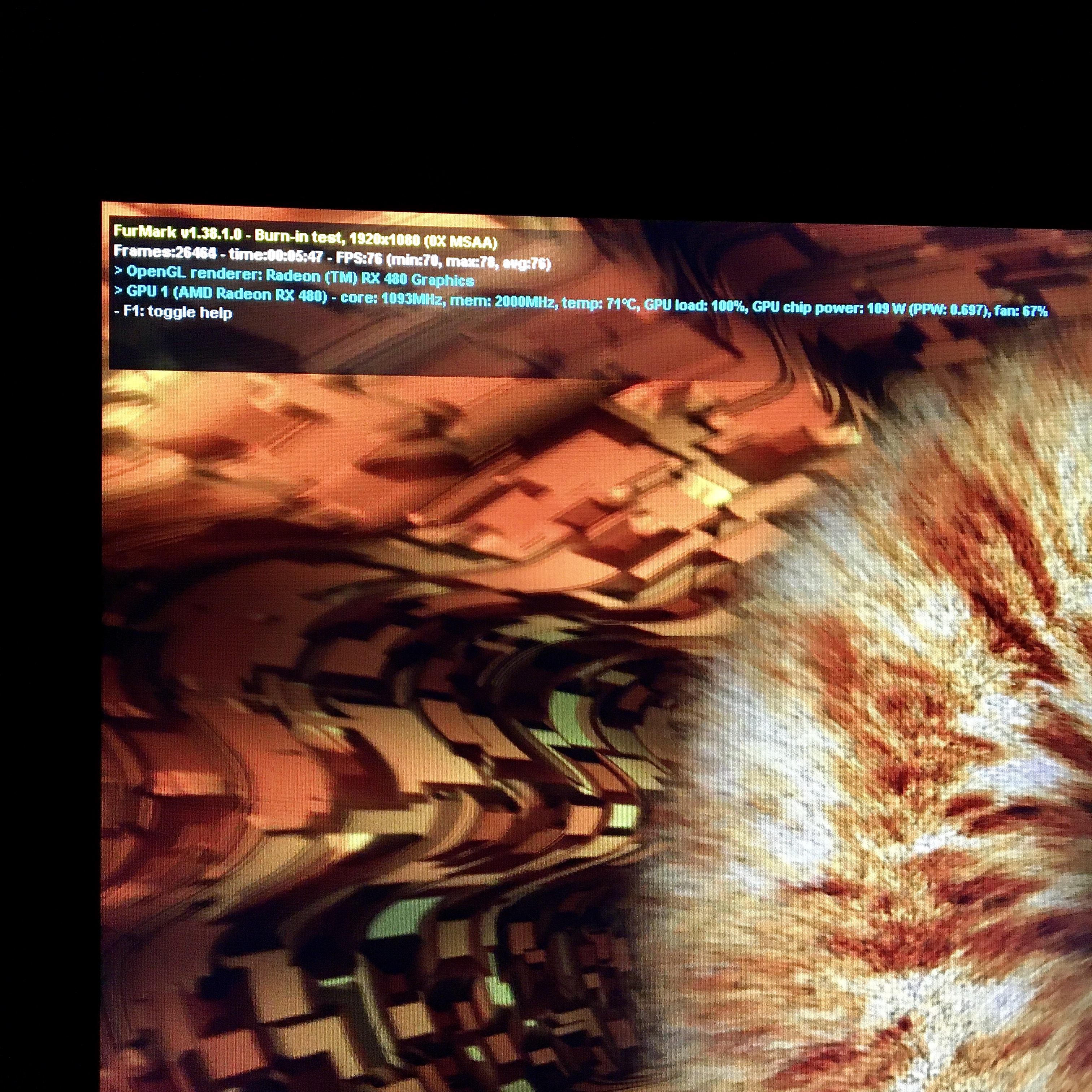 دمای بسیار مناسب و پایین در تست رزولوشن 1080 فورمارک نزدیک به 6 دقیقه دما 71 درجه 76 FPS (فریم بر ثانیه)